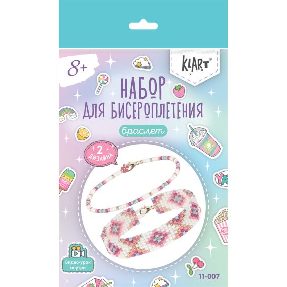 В набор для бисероплетения Klart входит: чешский бисер Gamma, капроновая нить, бисерные иглы, замочек-карабин, подробная инструкция с цветными иллюстрациями. В инструкции дан QR-код на видео-урок по бисероплетению. Наборы сертифицированы для детского творчества. Рекомендуемый возраст от 8 лет.