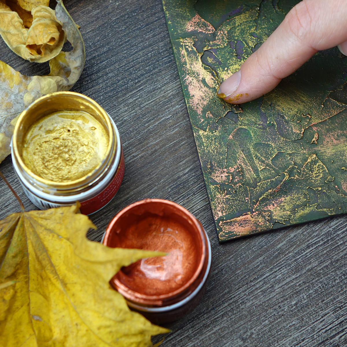 Густой, насыщенный металлическим пигментом состав на акриловой основе, для декорирования различных поверхностей. Придаёт мерцающий металлический блеск, не перекрывая фон полностью и не «забивая» текстуру поверхности.