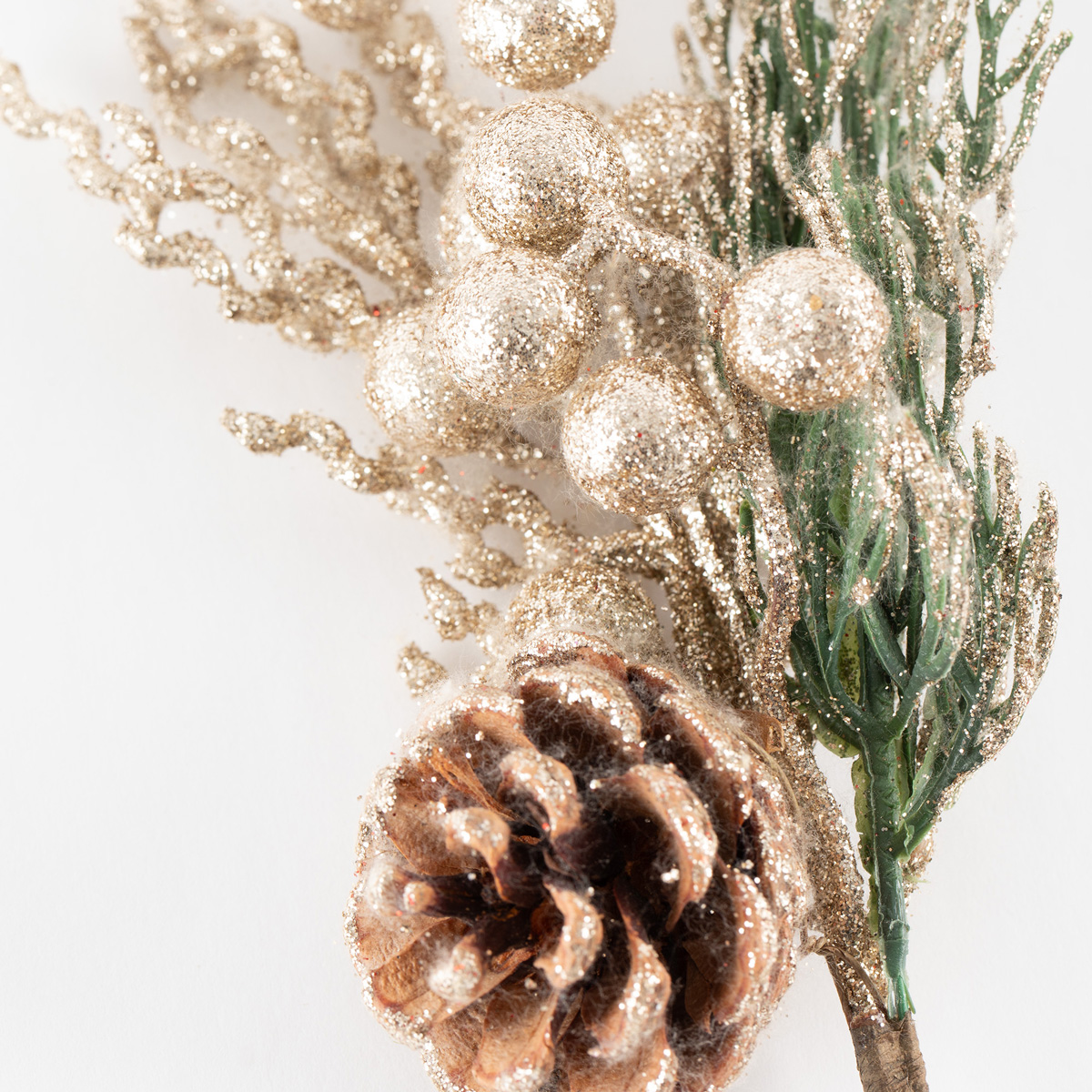 Декоративная веточка "Blumentag" VDD-48 используются во флористике, в композициях из искусственных цветов, в изготовлении новогодних венков, в топиариях, в декоре интерьера, оформлении подарков. Она прекрасно подойдет для создания осенней или зимней поделки. Основание из гибкой проволоки искусственной веточки обернуто флористической лентой, на веточке расположена натуральная шишка, искусственные хвойные веточки, фантазийные растения, покрытые золотистым оттенка глиттера, осыпание которого не является браком.