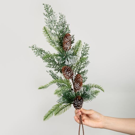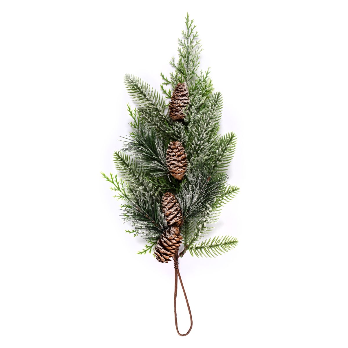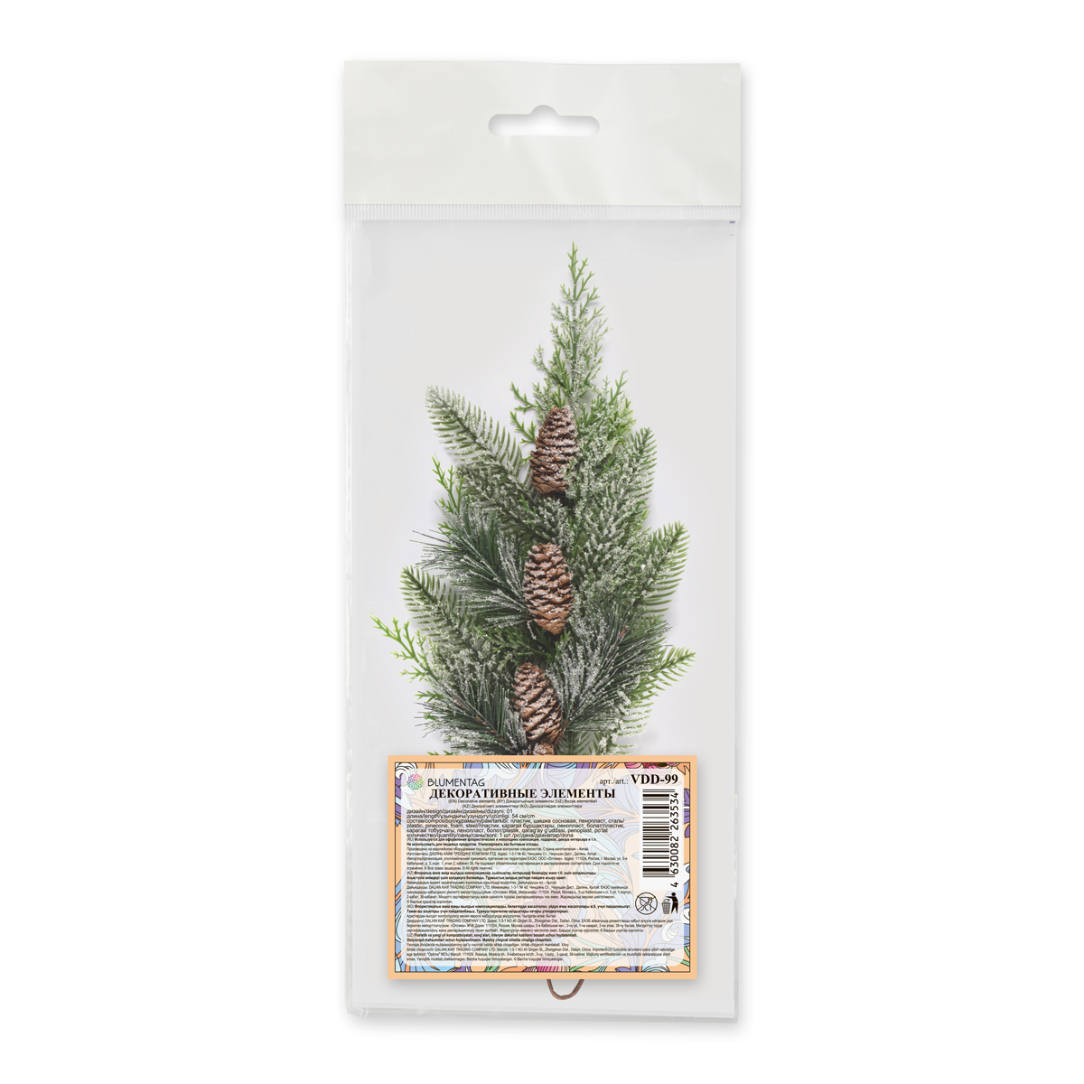 Декоративная веточка "Blumentag" VDD-99 используются во флористике, в композициях из искусственных цветов, в изготовлении новогодних венков, в топиариях, в декоре интерьера, оформлении подарков. Она прекрасно подойдет для создания зимней поделки. Основание из гибкой проволоки искусственной веточки обернуто флористической лентой, на веточке расположены искусственная хвоя с имитацией инея и натуральные шишки.
