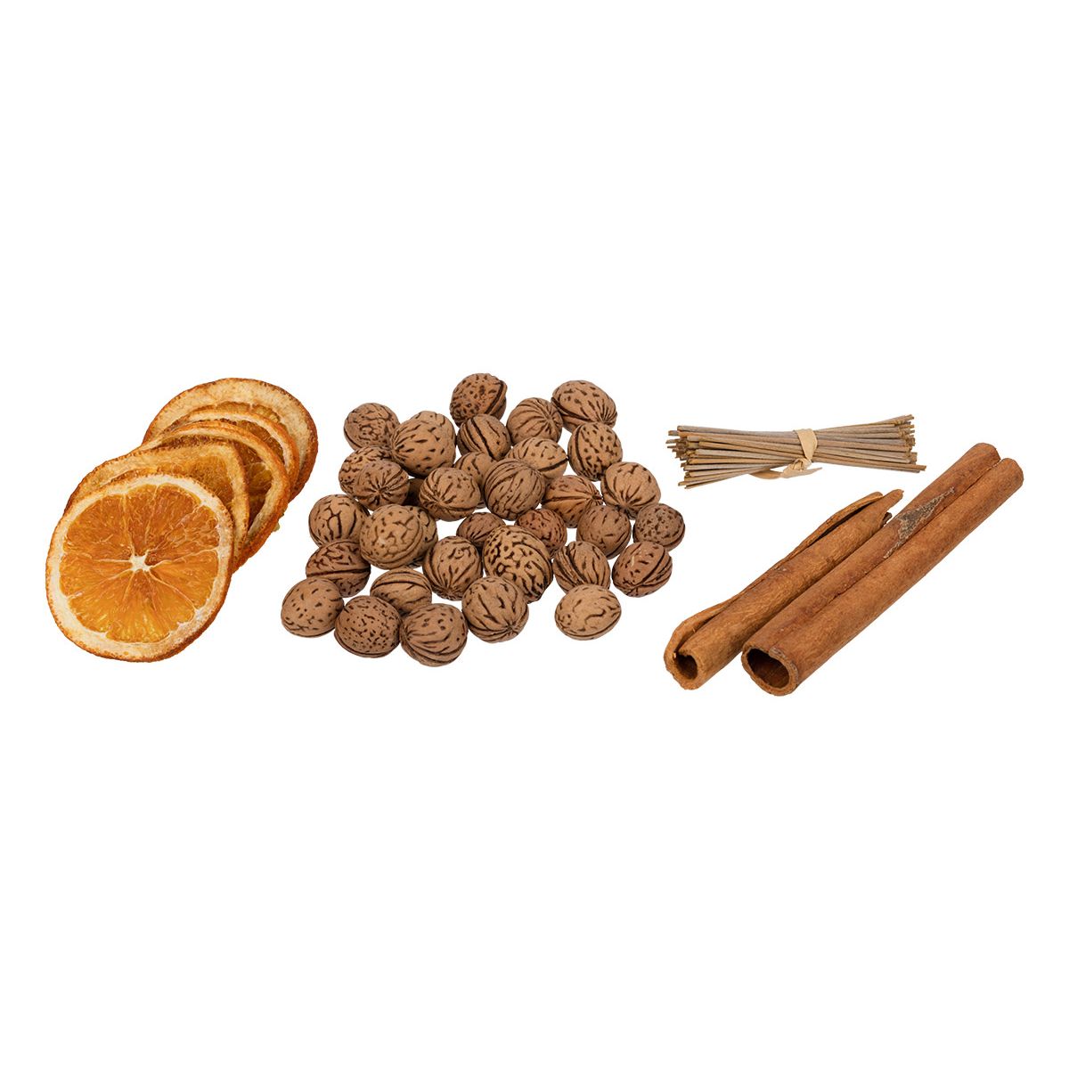 Набор с палочками корицы, сушеным апельсином, косточками и стеблями растений используется для создания флористических интерьерных композиций, цветочных композиций, можно использовать как основу при изготовлении топиариев и венков, послужит отличным декором при оформлении подарочных корзин с фруктами, чайных и кофейных наборов, так же применяется при оформлении подарков.