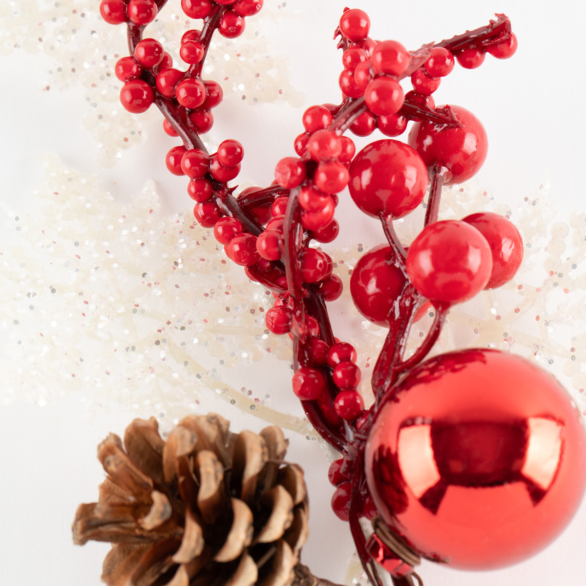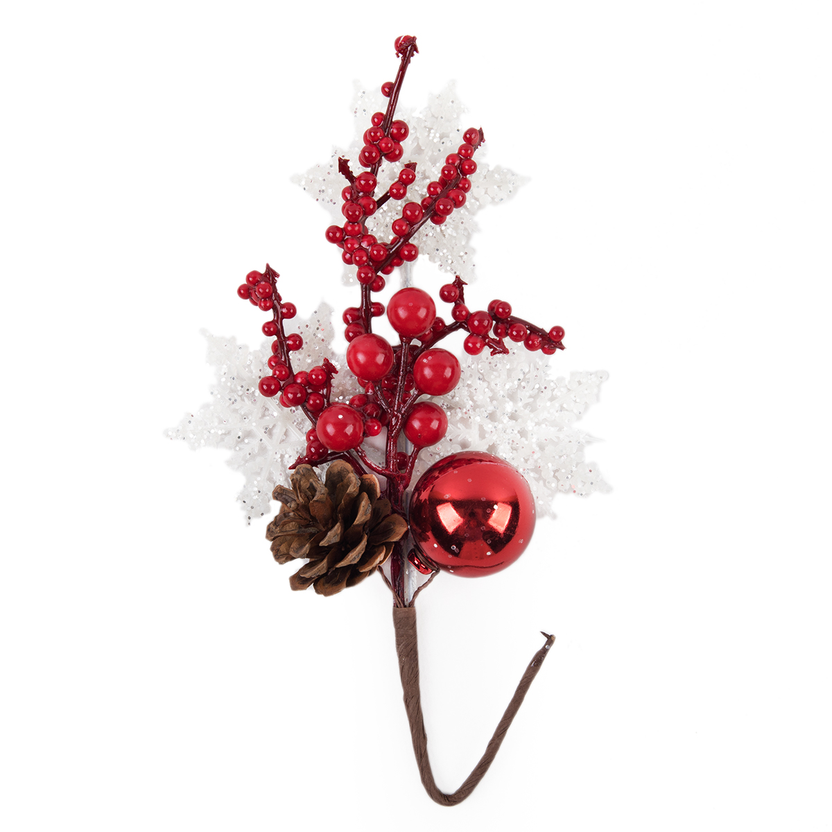 Декоративная веточка "Blumentag" VDD-122 используются во флористике, в композициях из искусственных цветов, в изготовлении новогодних венков, в топиариях, в декоре интерьера, оформлении подарков. Она прекрасно подойдет для создания осенней или зимней поделки. Основание из гибкой проволоки искусственной веточки обернуто флористической лентой, на веточке расположены декоративные ягоды и снежинки, красный шарик и натуральная шишка.