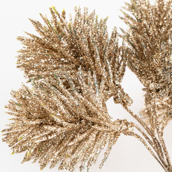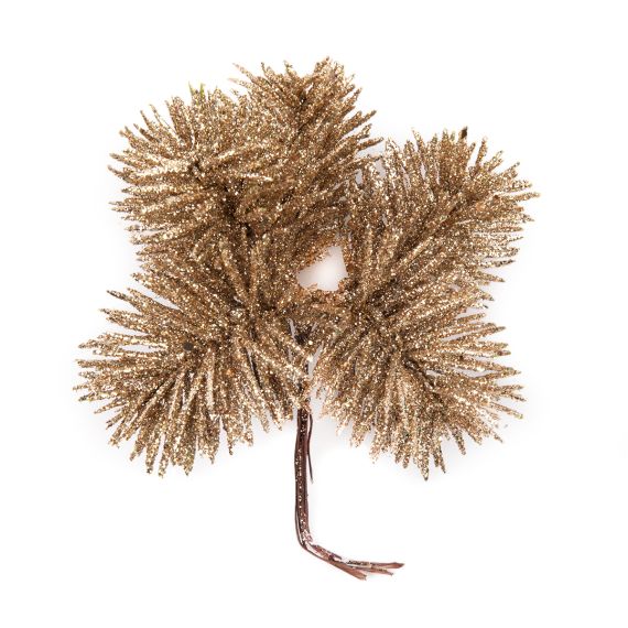 Декоративная веточка "Blumentag" VDD-139 используются во флористике, в композициях из искусственных цветов, в изготовлении новогодних венков, в топиариях, в декоре интерьера, оформлении подарков. Она прекрасно подойдет для создания осенней или зимней поделки. Основание из гибкой проволоки искусственной веточки обернуто флористической лентой, искусственная хвоя покрыта золотистым оттенком глиттера. Осыпание глиттера не является браком.