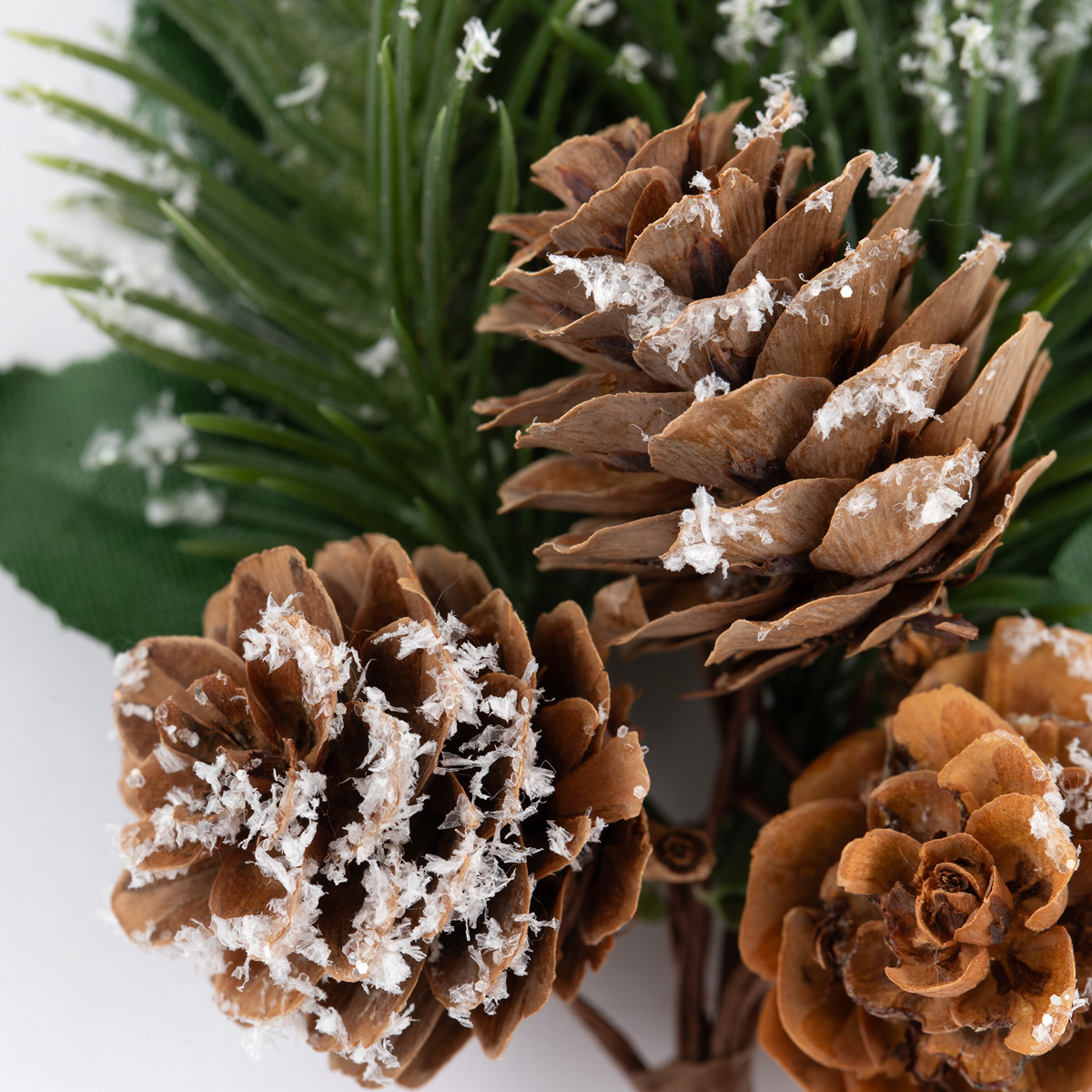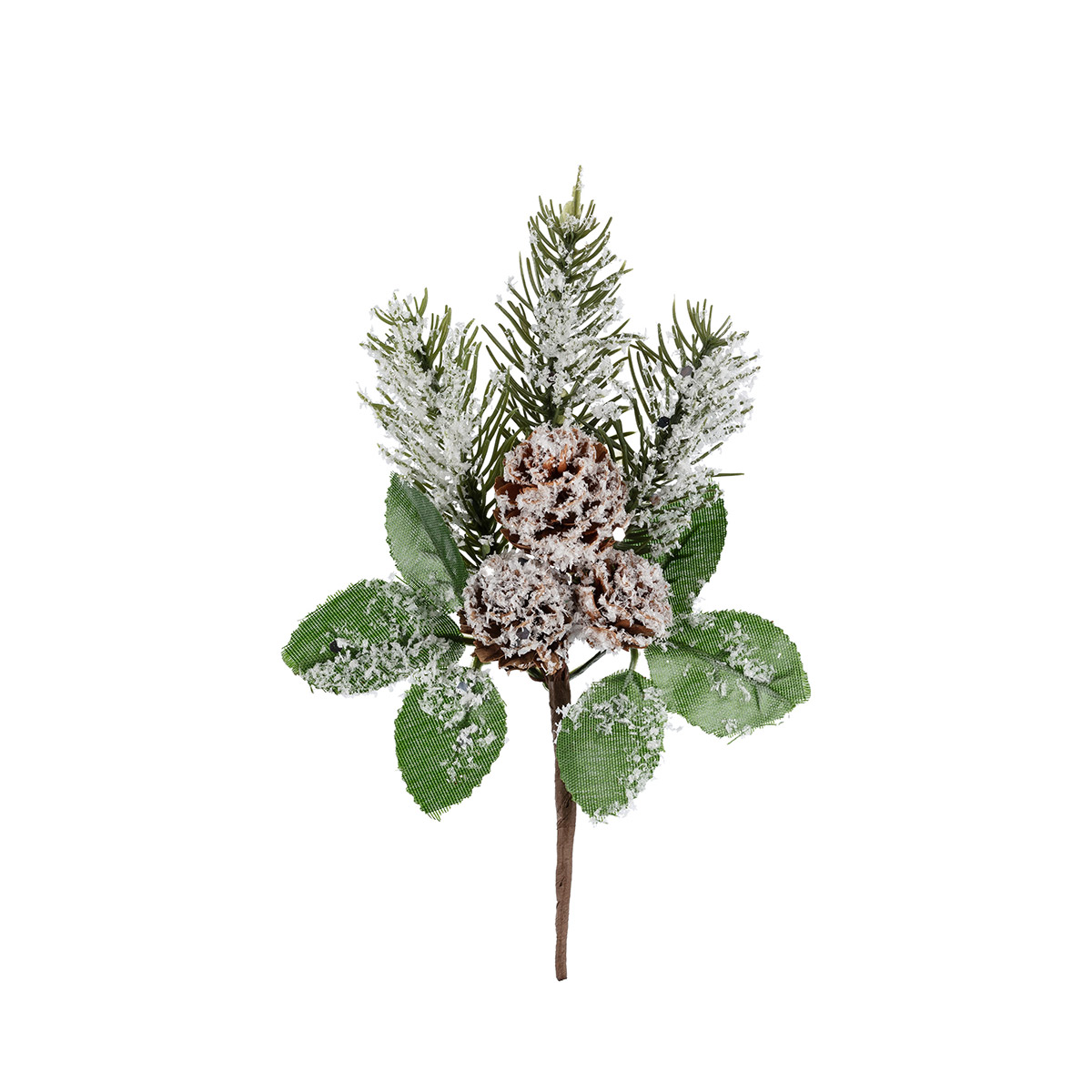 Декоративная веточка с имитацией инея "Blumentag" VDD-65 используются во флористике, в композициях из искусственных цветов, в изготовлении новогодних венков, в топиариях, в декоре интерьера, оформлении подарков. Заснеженная искусственная веточка прекрасно подойдет для создания осенней или зимней поделки. Основание из гибкой проволоки искусственной веточки обернуто флористической лентой, на веточке расположены декоративные листья и хвойные веточки, шишки.