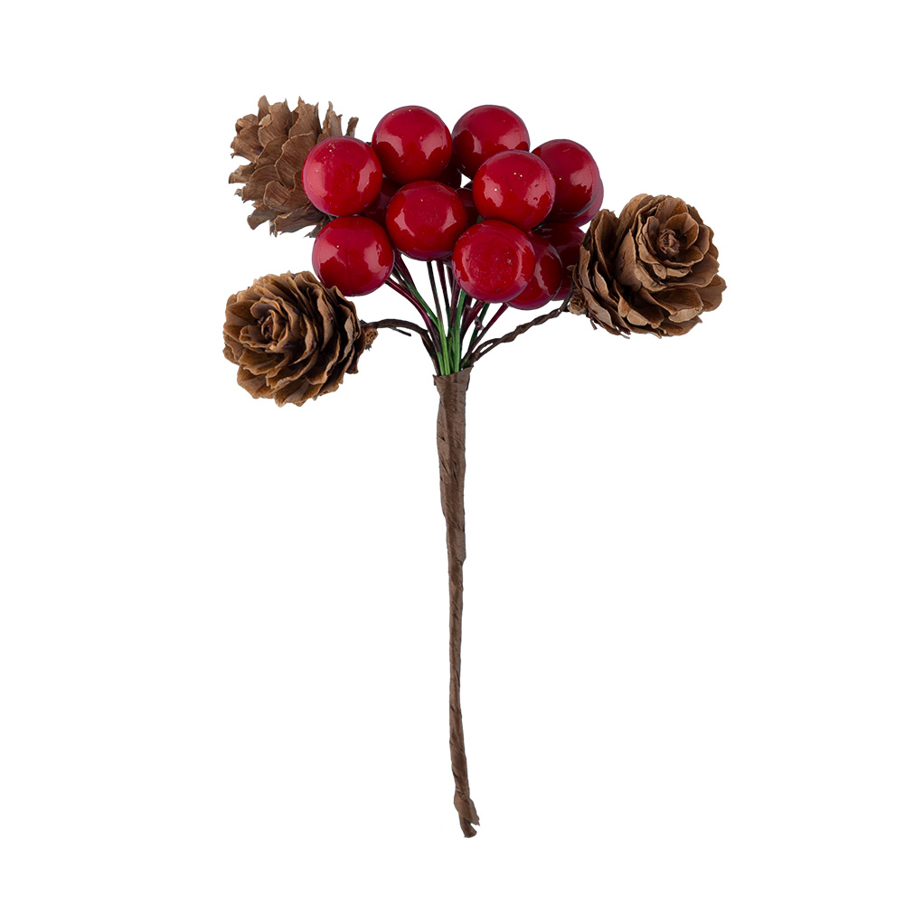 Декоративные элементы "букет из ягод калины и шишек" "Blumentag" VDF-01 используются во флористике, в композициях из искусственных цветов, в букетах из конфет, в топиариях, в декоре интерьера, подарков. Снабжены веточкой – проволокой, позволяющей крепить их к элементам флористической, подарочной и любой другой композиции.