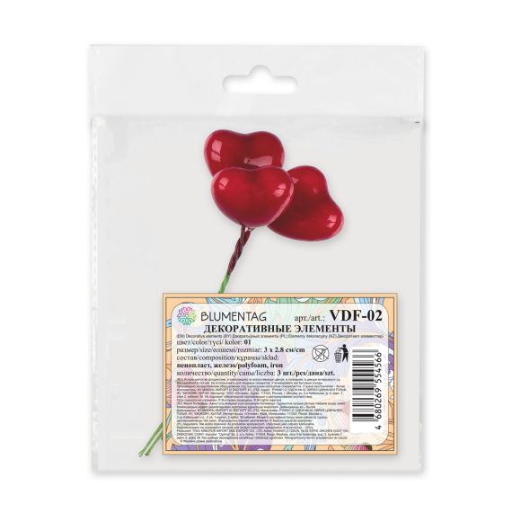 Декоративные элементы "сердце" "Blumentag" VDF-02 используются во флористике, в композициях из искусственных цветов, в букетах из конфет, в топиариях, в декоре интерьера, подарков. Снабжены веточкой – проволокой, позволяющей крепить их к элементам флористической, подарочной и любой другой композиции.