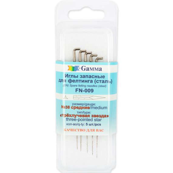 Иглы для валяния "Gamma" FN-009. В блистере 5 сменных игл для фелтинга имеют форму трехгранной звезды. Иглы очень острые, поэтому рекомендуем работать не спеша, на подложке арт.FN-003, FN-004. Рекомендуем приобретать запасные иглы FN-009 №38 подходят к наборам арт. FN006 /игла с разборной деревянной ручкой/ и FN007 /набор для валяния 7 иглами/.