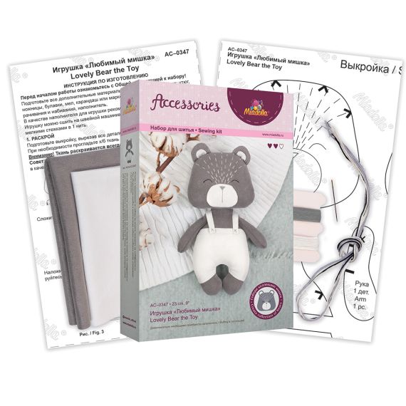 В набор входят все необходимые материалы кроме наполнителя: ткань 100% хлопок, искусственная замша, хлопчатобумажные нитки мулине Gamma, швейные нитки, швейная игла, выкройка, подробная инструкция с картинками.