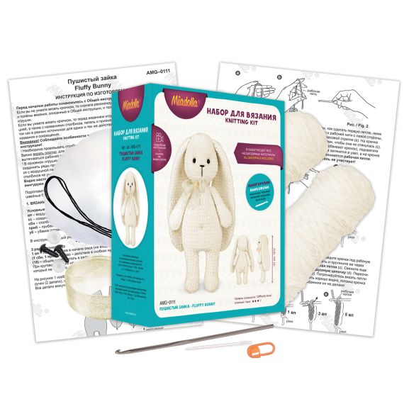 В набор входят все необходимые материалы для изготовления игрушки: велюровая пряжа , крючок для вязания 4 мм, маркировочное кольцо, пластиковые глаза с шайбами, пластиковая игла, хлопчатобумажные нитки мулине Gamma, капроновая лента, синтепух, подробная инструкция с картинками.