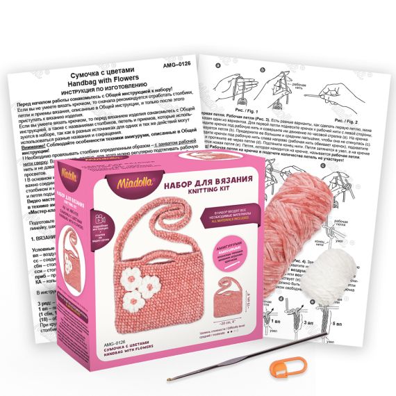 В набор входят все необходимые материалы для изготовления сумочки: велюровая пряжа , крючок для вязания 4 мм, маркировочное кольцо, пластиковая игла, подробная инструкция с картинками.