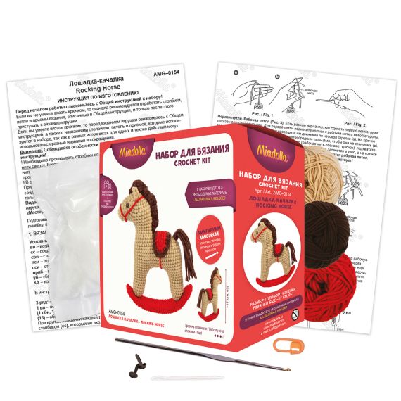В набор входят все необходимые материалы для изготовления игрушки: пряжа , крючок для вязания 2.5 мм, глаза, маркировочное кольцо, пластиковая игла, синтепух, подробная инструкция с картинками.
