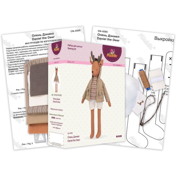 В набор входят все необходимые материалы для изготовления игрушки: лен, ткань 100% хлопок, трикотаж, брадсы, хлопчатобумажные нитки мулине Gamma, швейные нитки, швейная игла, синтепух, выкройка, подробная инструкция с картинками.