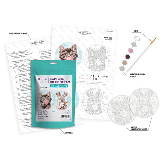 Состав набора: 2 холста на магнитной основе с нанесенным изображением, акриловые краски в пронумерованных баночках, кисть, инструкция с контрольным листом, схемой смешения цветов и эталоном готовой работы.