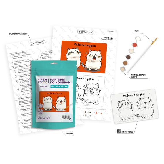 Состав набора: холст на магнитной основе с нанесенным изображением, акриловые краски в пронумерованных баночках, кисть, инструкция с контрольным листом, схемой смешения цветов и эталоном готовой работы.