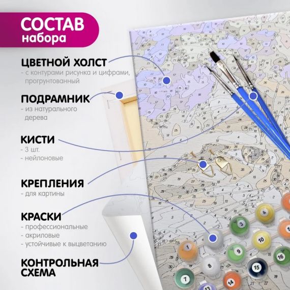 В набор входят: Холст из натурального хлопка на деревянном подрамнике Нейлоновые деревянные кисти разного размера: 2 шт. Профессиональные акриловые краски, устойчивые к выцветанию: 22 цв.