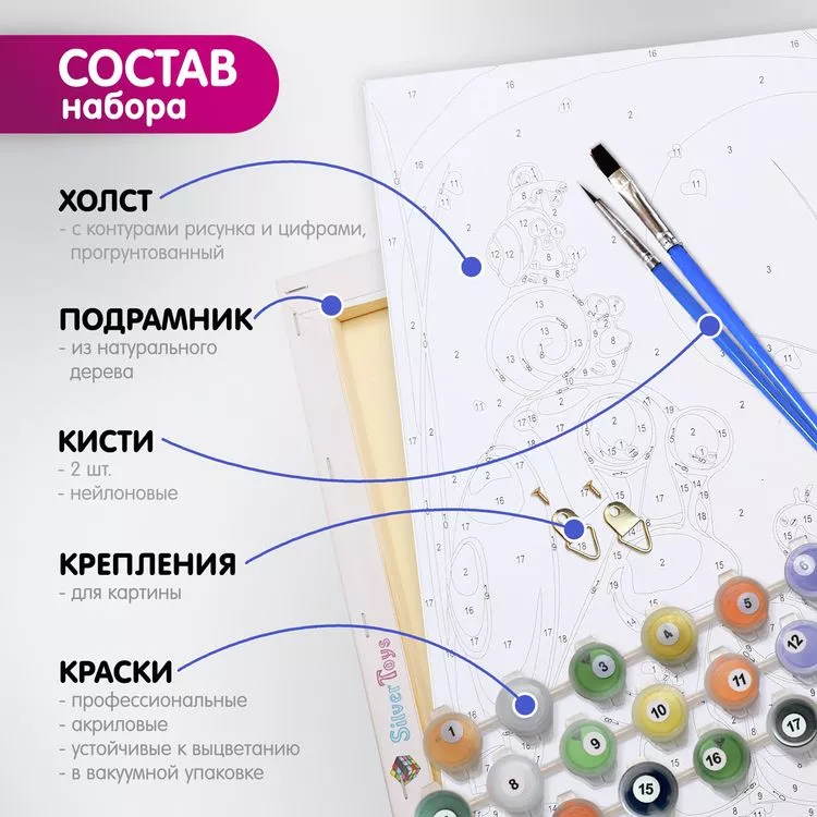 Состав набора: холст из натурального хлопка на деревянном подрамнике (холст предварительно прогрунтован), 2 нейлоновые кисти разного размера, профессиональные акриловые краски (устойчивые к выцветанию).