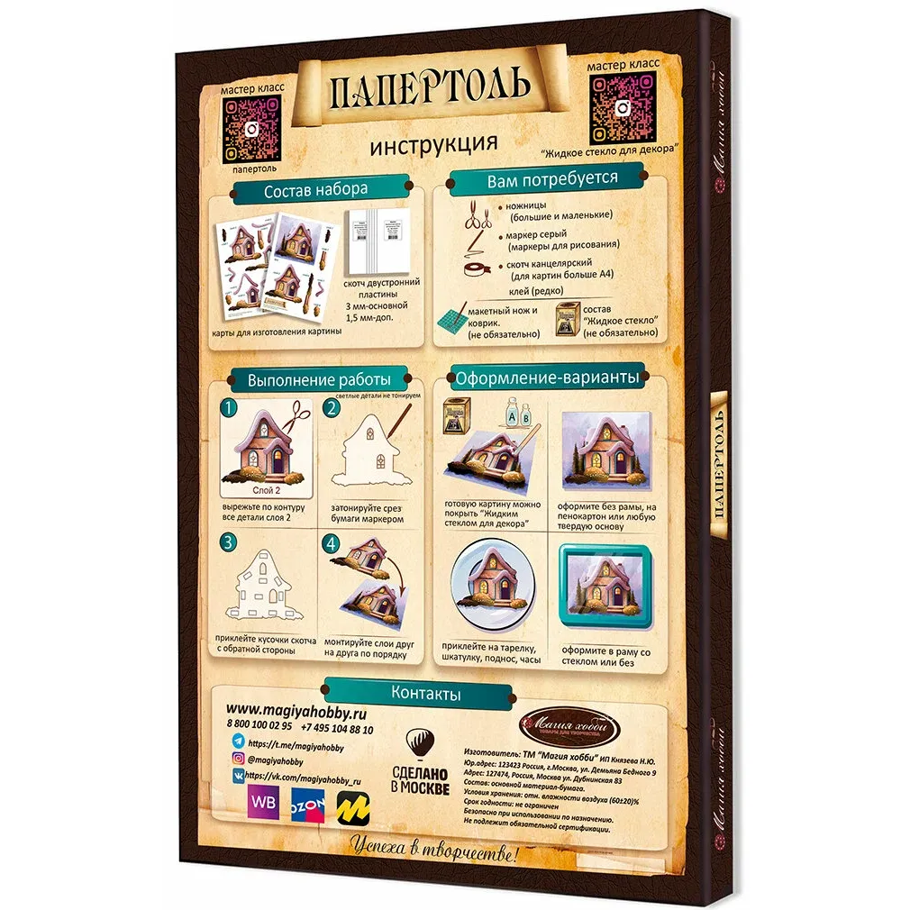 Техника Папертоль - объемное 3D-изображение из бумаги, созданное собственноручно. Простая в исполнении, но очень необычная техника. Набор содержит разобранное "по слоям" изображение картины, выполненное на качественной плотной бумаге и инструкцию, по выполнению работы. Для того, чтобы собрать объемное изображение, дополнительно понадобятся (в набор не входят): хорошие ножницы или нож для рукоделия, для вырезания деталей композиции; двусторонние клеевые подушечки или двусторонний скотч - плоский и объемный; фломастеры для закрашивания обрезанного края. Нужно вырезать все элементы и склеить их при помощи двустороннего скотча. Чтобы придать композиции дополнительный объем, слои "приподнимают" при помощи клеевых подушечек или объемного двустороннего скотча. Готовую работу можно залить жидким стеклом или оформить в рамку и украсить дизайн интерьера. Если же это миниатюра, то она сделает эксклюзивной открытку к любому празднику.