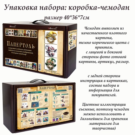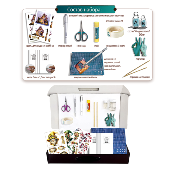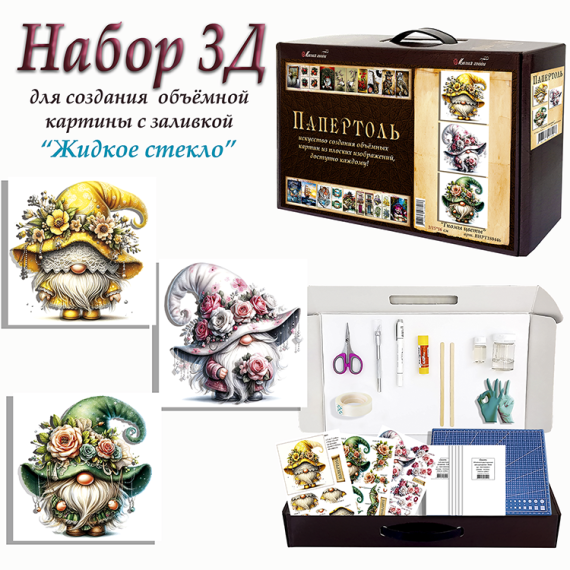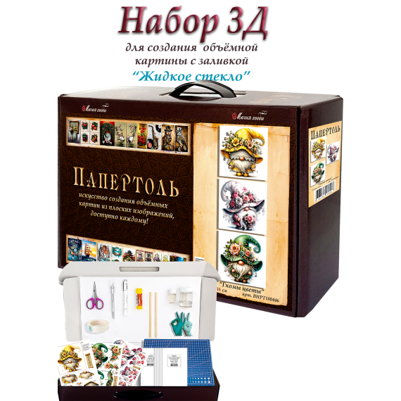 Папертоль – объемные картины из бумаги, техника ручного вырезания и создания объемных, 3D трехмерных изображений из бумаги. Простая в исполнении, но очень необычная техника. Карты содержат разобранное “по слоям” изображение картины, выполненное на качественной плотной бумаге. Нужно вырезать все элементы и склеить их при помощи двустороннего объемного скотча. Свою картину вы можете дополнить, защитить и сделать более долговечной с помощью полимерного состава «Жидкое стекло для декора» входящим в набор.