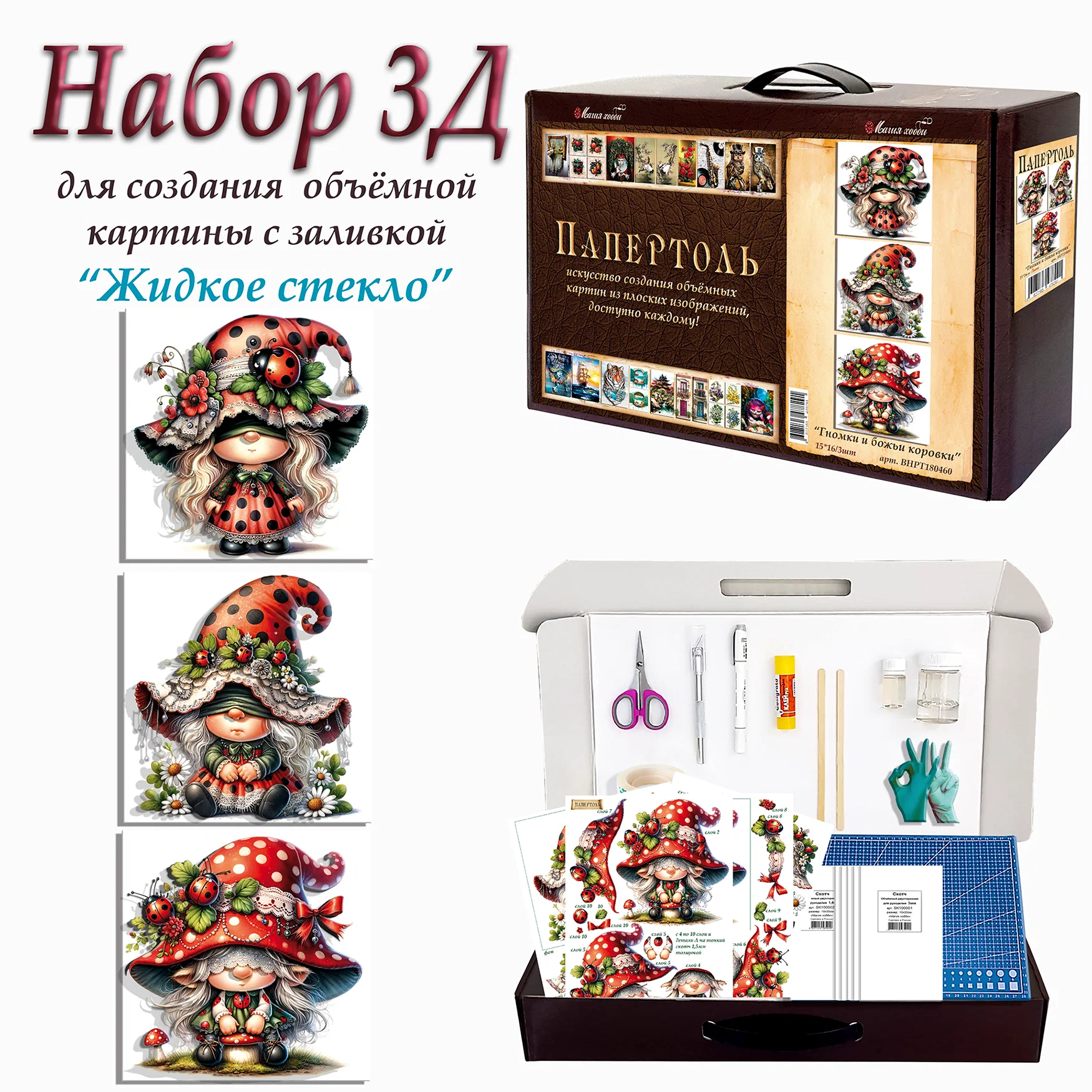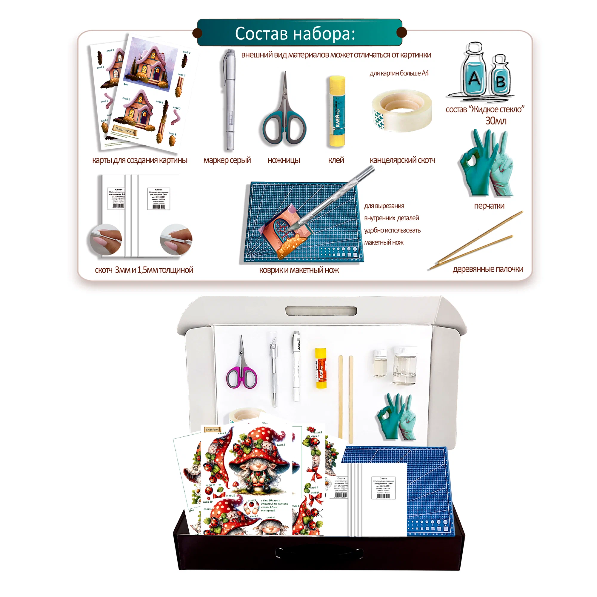 Папертоль – объемные картины из бумаги, техника ручного вырезания и создания объемных, 3D трехмерных изображений из бумаги. Простая в исполнении, но очень необычная техника. Карты содержат разобранное “по слоям” изображение картины, выполненное на качественной плотной бумаге. Нужно вырезать все элементы и склеить их при помощи двустороннего объемного скотча. Свою картину вы можете дополнить, защитить и сделать более долговечной с помощью полимерного состава «Жидкое стекло для декора» входящим в набор.