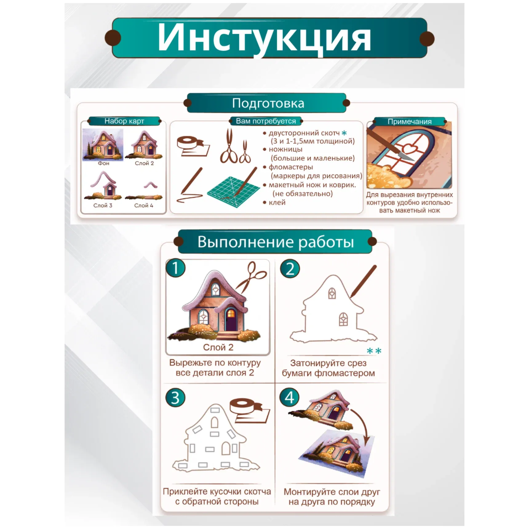 - Набор карт для создания картины (разобранное “по слоям” изображение), выполненное на качественной плотной бумаге;