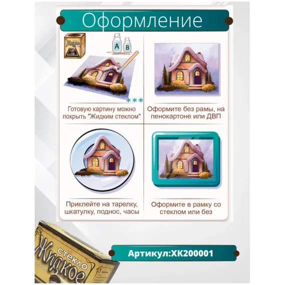 Свою картину вы можете дополнить, защитить и сделать более долговечной с помощью полимерного состава «Жидкое стекло для декора» артикул XK200001. Состав позволяет сделать на любой поверхности прозрачное глянцевое покрытие высокой прочности. Не требует тепловой обработки, не токсичен!