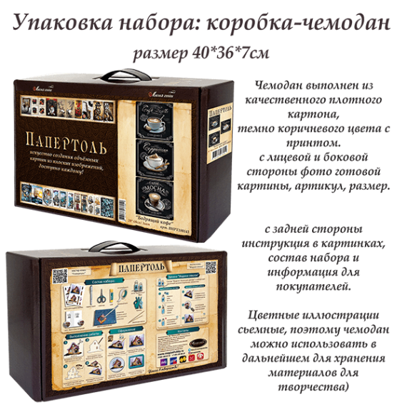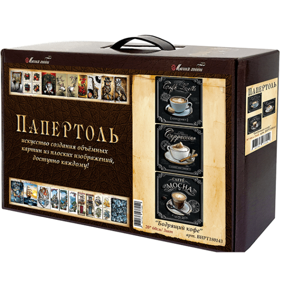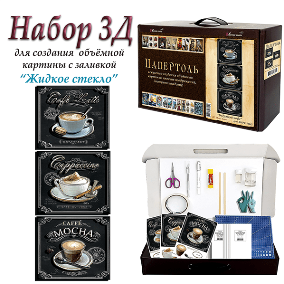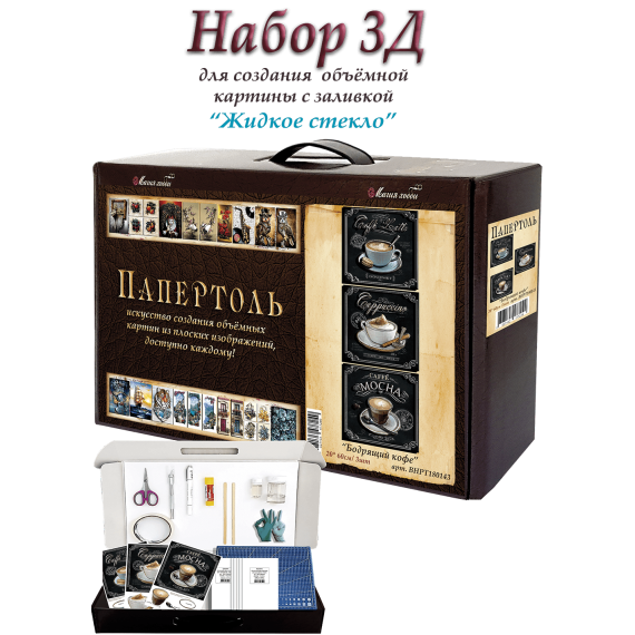 Папертоль – объемные картины из бумаги, техника ручного вырезания и создания объемных, 3D трехмерных изображений из бумаги. Простая в исполнении, но очень необычная техника. Карты содержат разобранное “по слоям” изображение картины, выполненное на качественной плотной бумаге. Нужно вырезать все элементы и склеить их при помощи двустороннего объемного скотча. Свою картину вы можете дополнить, защитить и сделать более долговечной с помощью полимерного состава «Жидкое стекло для декора» входящим в набор.
