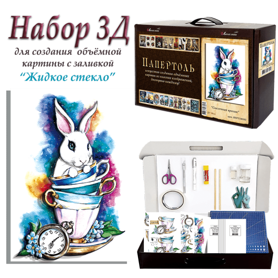 Папертоль – объемные картины из бумаги, техника ручного вырезания и создания объемных, 3D трехмерных изображений из бумаги. Простая в исполнении, но очень необычная техника. Карты содержат разобранное “по слоям” изображение картины, выполненное на качественной плотной бумаге. Нужно вырезать все элементы и склеить их при помощи двустороннего объемного скотча. Свою картину вы можете дополнить, защитить и сделать более долговечной с помощью полимерного состава «Жидкое стекло для декора» входящим в набор.
