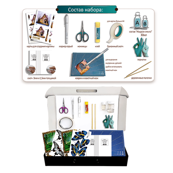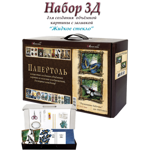 Папертоль – объемные картины из бумаги, техника ручного вырезания и создания объемных, 3D трехмерных изображений из бумаги. Простая в исполнении, но очень необычная техника. Карты содержат разобранное “по слоям” изображение картины, выполненное на качественной плотной бумаге. Нужно вырезать все элементы и склеить их при помощи двустороннего объемного скотча. Свою картину вы можете дополнить, защитить и сделать более долговечной с помощью полимерного состава «Жидкое стекло для декора» входящим в набор.