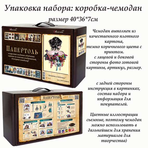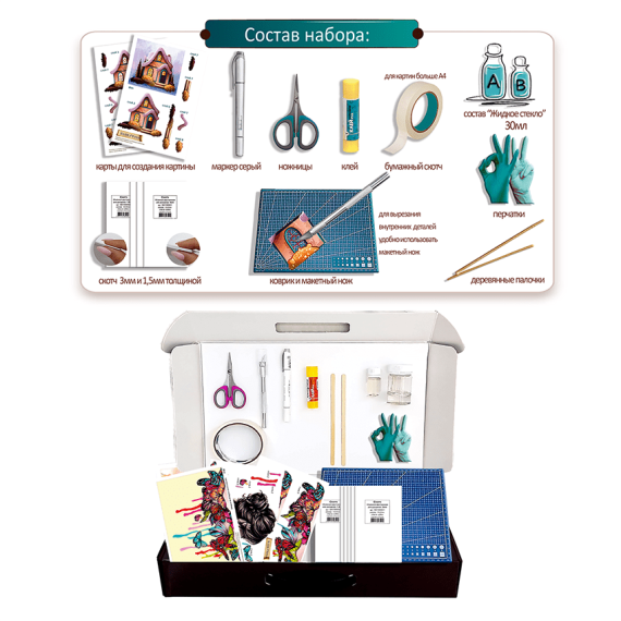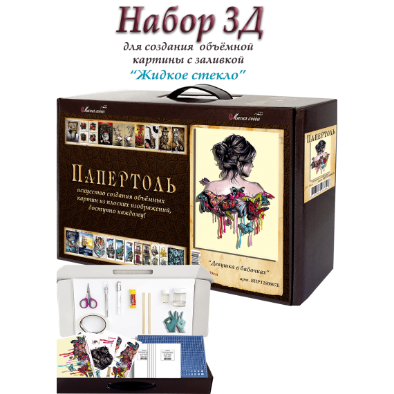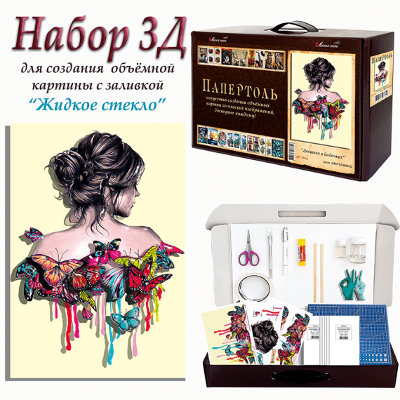 Папертоль – объемные картины из бумаги, техника ручного вырезания и создания объемных, 3D трехмерных изображений из бумаги. Простая в исполнении, но очень необычная техника. Карты содержат разобранное “по слоям” изображение картины, выполненное на качественной плотной бумаге. Нужно вырезать все элементы и склеить их при помощи двустороннего объемного скотча. Свою картину вы можете дополнить, защитить и сделать более долговечной с помощью полимерного состава «Жидкое стекло для декора» входящим в набор.