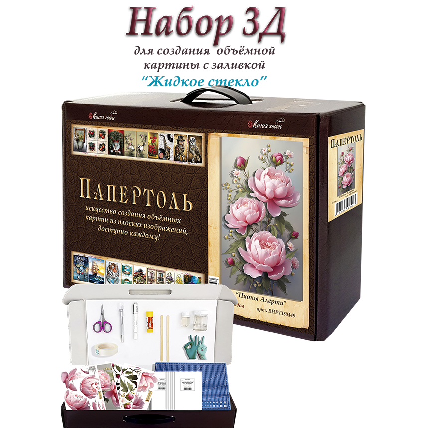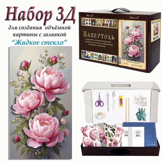 Папертоль – объемные картины из бумаги, техника ручного вырезания и создания объемных, 3D трехмерных изображений из бумаги. Простая в исполнении, но очень необычная техника. Карты содержат разобранное “по слоям” изображение картины, выполненное на качественной плотной бумаге. Нужно вырезать все элементы и склеить их при помощи двустороннего объемного скотча. Свою картину вы можете дополнить, защитить и сделать более долговечной с помощью полимерного состава «Жидкое стекло для декора» входящим в набор.