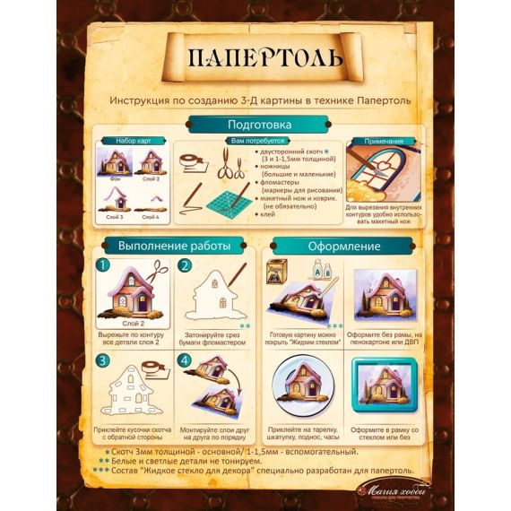 Как создать папертоль? Нужно вырезать все элементы и склеить их при помощи двустороннего скотча, который входит в набор, закрасить торцы элементов серым маркером. Готовую работу можно залить Жидким стеклом (не входит в набор) или оформить в рамку и украсить дизайн интерьера. Если же это миниатюра, то она сделает эксклюзивной открытку к любому празднику.
