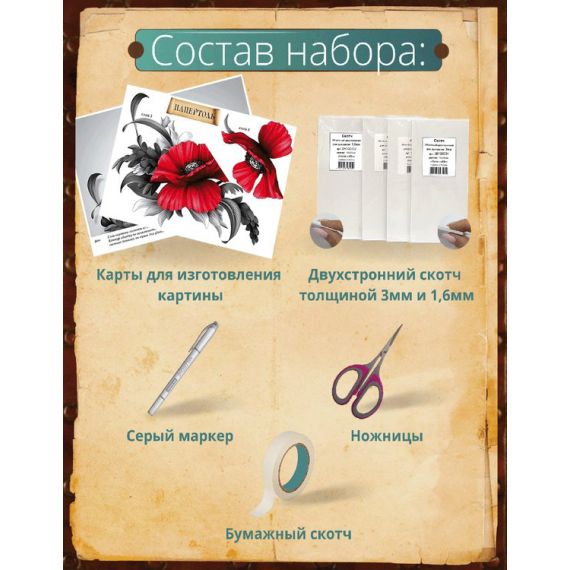 - Набор карт для создания картины (разобранное “по слоям” изображение), выполненное на качественной плотной бумаге;