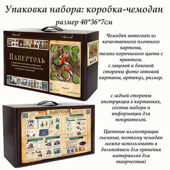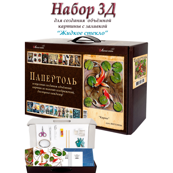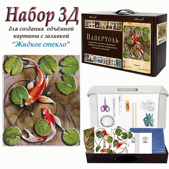 Папертоль – объемные картины из бумаги, техника ручного вырезания и создания объемных, 3D трехмерных изображений из бумаги. Простая в исполнении, но очень необычная техника. Карты содержат разобранное “по слоям” изображение картины, выполненное на качественной плотной бумаге. Нужно вырезать все элементы и склеить их при помощи двустороннего объемного скотча. Свою картину вы можете дополнить, защитить и сделать более долговечной с помощью полимерного состава «Жидкое стекло для декора» входящим в набор.