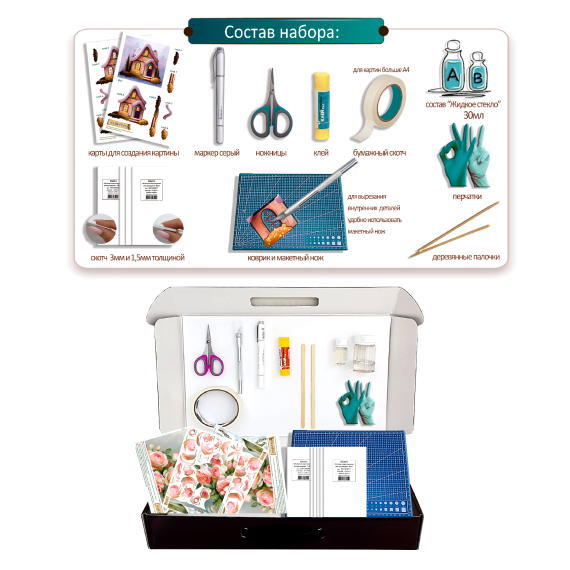 - Набор карт для создания картины (разобранное “по слоям” изображение), выполненное на качественной плотной бумаге;