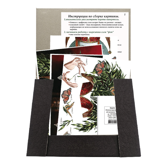 В набор входит: – карта для изготовления картины – двусторонний скотч 1,6мм.,3мм. – нужен для склеивания слоев – инструкция