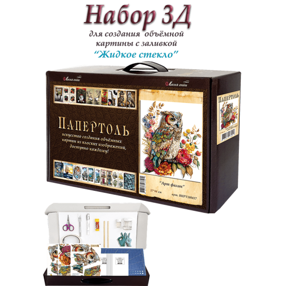 Папертоль – объемные картины из бумаги, техника ручного вырезания и создания объемных, 3D трехмерных изображений из бумаги. Простая в исполнении, но очень необычная техника. Карты содержат разобранное “по слоям” изображение картины, выполненное на качественной плотной бумаге. Нужно вырезать все элементы и склеить их при помощи двустороннего объемного скотча. Свою картину вы можете дополнить, защитить и сделать более долговечной с помощью полимерного состава «Жидкое стекло для декора» входящим в набор.