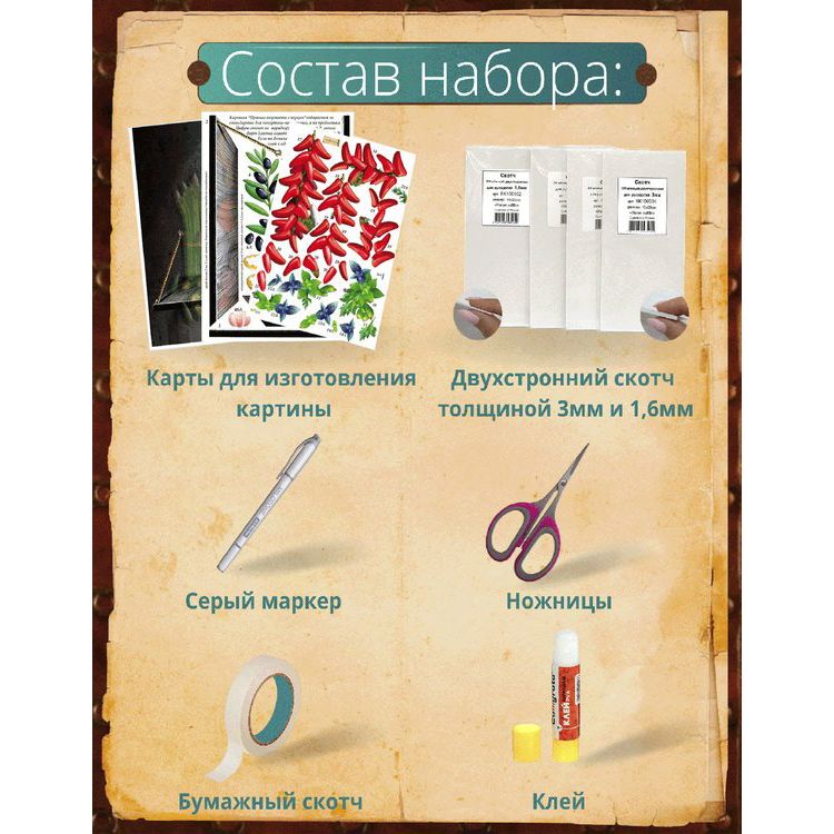 - Набор карт для создания картины (разобранное “по слоям” изображение), выполненное на качественной плотной бумаге;