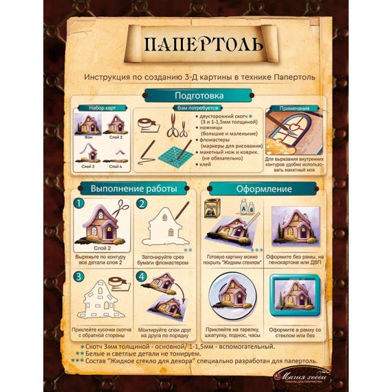 Техника Папертоль - объемное 3D-изображение из бумаги, созданное собственноручно. Простая в исполнении, но очень необычная техника. Набор содержит разобранное “по слоям” изображение картины, выполненное на качественной плотной бумаге и инструкцию, по выполнению работы.