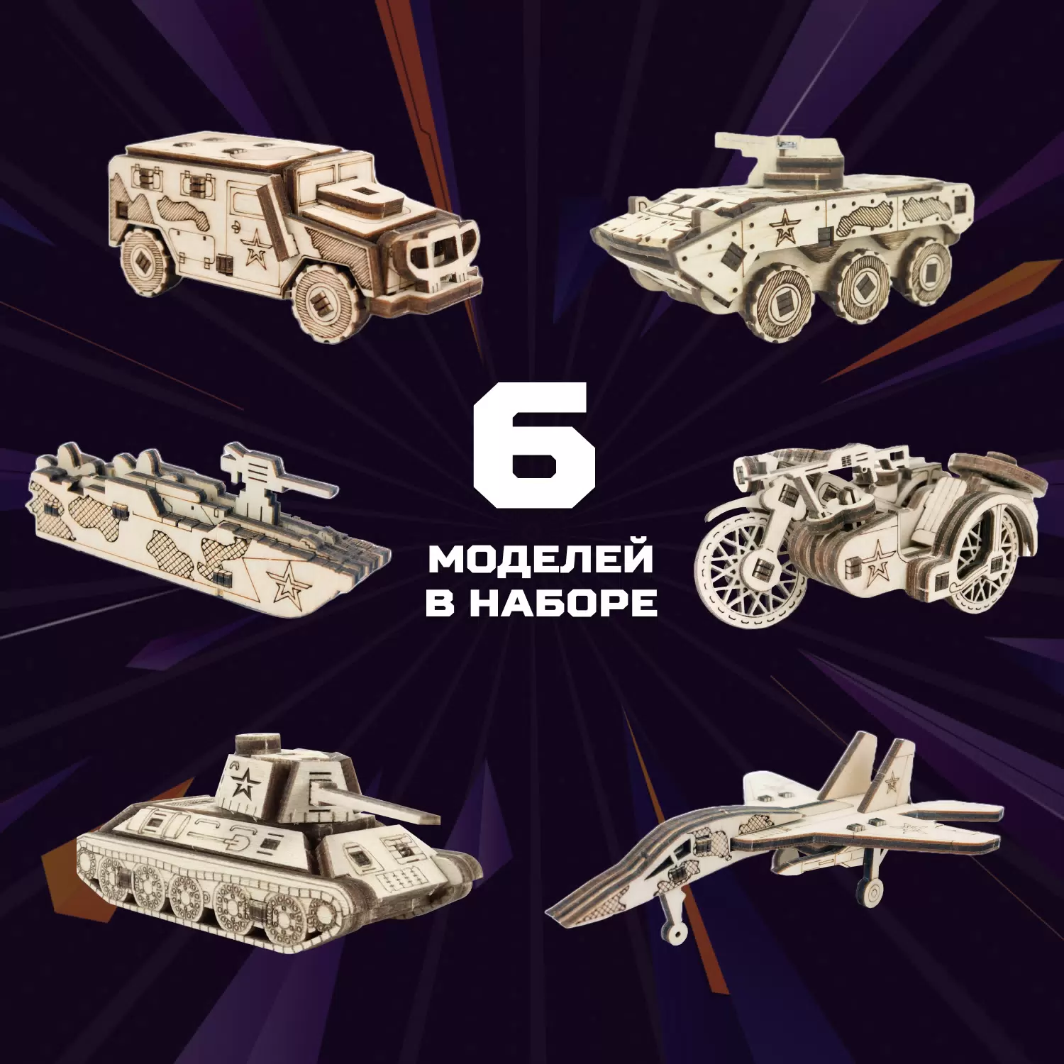 В набор входят 6 деревянных модели для сборки: Истребитель, Катер Раптор, Бронеавтомобиль, Мотоцикл, БТР, Танк Т-34.