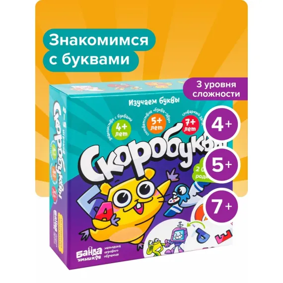 «Скоробуквы» — динамичная игра, которая познакомит с буквами и закрепит ассоциативное восприятие «буква-звук»: А — ананас, Б — бобер. Увлекает с первого хода — хватать яркие фишки любят и дети, и взрослые! А яркие сюжеты расширяют словарный запас и тренируют воображение.
