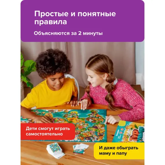 Дети от 4 лет могут начать играть в "Тур культур" даже если еще не умеют читать! В варианте правил "Быстрее всех" для ребят помладше используется простое игровое поле и цветные части игровых карт. Малышам предстоит находить на игровом поле объекты с игровых карт, соревнуясь в скорости.