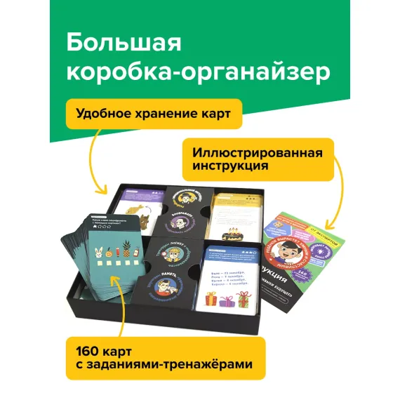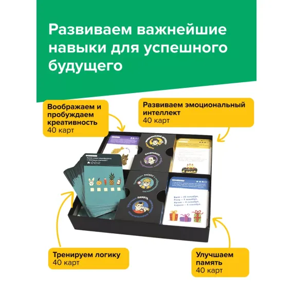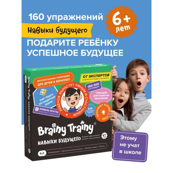 Этому не научат школьные учебники! Большой подарочный набор карточек «Навыки будущего» - подарок, который изменит жизнь ребенка! Научит думать и находить ответы на любые вопросы. В большой коробке - 160 лучших заданий из семьи Brainy Trainy. Каждое задание - это приключение, направленное на развитие высокоэффективных навыков школьника и дошкольника! Тренажер приведет в действие логику, эмоциональный интеллект, воображение, память. Всё это гибкие навыки soft skills. В наборе развивающие обучающие карты разной сложности из 4 разделов. Для мальчиков и девочек 6, 7, 8, 9 лет. На обороте карты - ответ. Комплекс упражнений разработало бюро Банда умников. Развивающая игра поможет ребенку анализировать информационный поток. Brainy Trainy - не просто карточки квиз-викторины, а балансир для ума, твистер-фитнес iq, нейротренажер интеллекта, кортекс гимнастика системного мышления. Развиваем мозг и уно моменто готовимся к школе!
