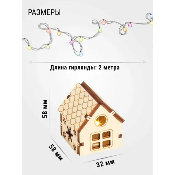 DROVO «Новогодняя гирлянда Домики» — это уютное и атмосферное новогоднее украшение длиной 2 метра, которое создаёт праздничное настроение и наполняет дом волшебством. В наборе — миниатюрные деревянные домики размером 40×40×50 мм, собранные из 56 аккуратно вырезанных деталей. Такая новогодняя гирлянда идеально подойдёт для украшения ёлки, окна, камина, стены или праздничного стола.
