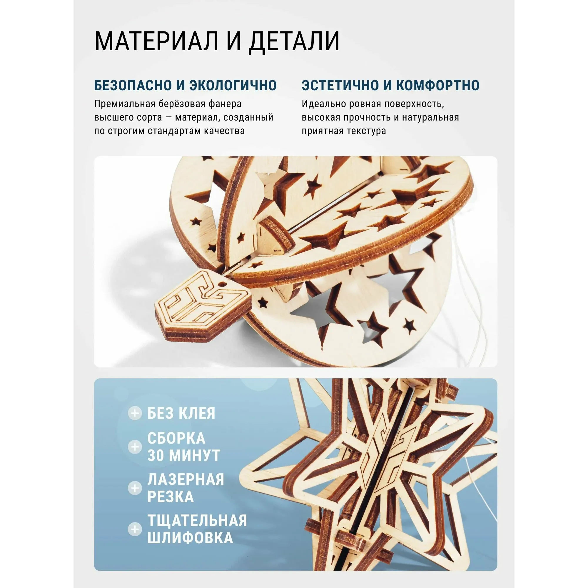 Такой набор станет уникальным украшением новогодней ёлки и прекрасным подарком для детей и взрослых. Процесс сборки прост и увлекателен: детали легко соединяются без клея, а гладкая поверхность дерева делает сборку приятной и безопасной.