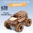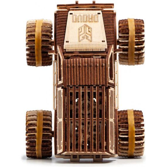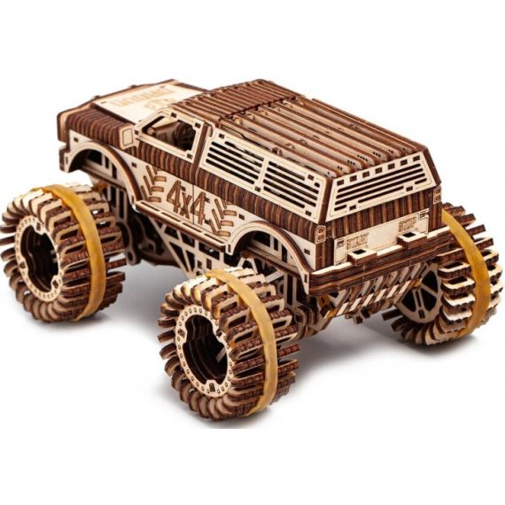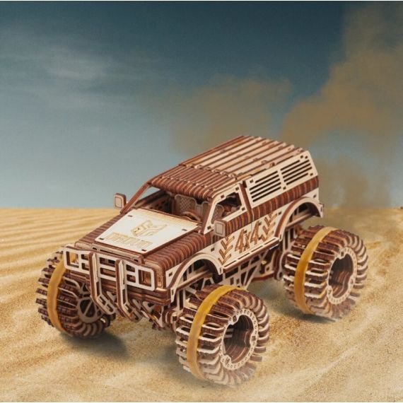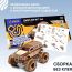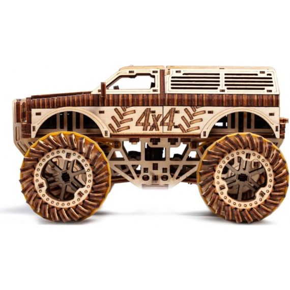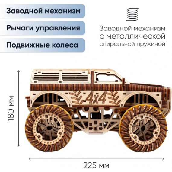 Сборная модель из дерева представляет собой вездеходных джип с большой детализацией и амортизирующей подвеской.
