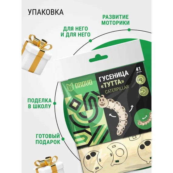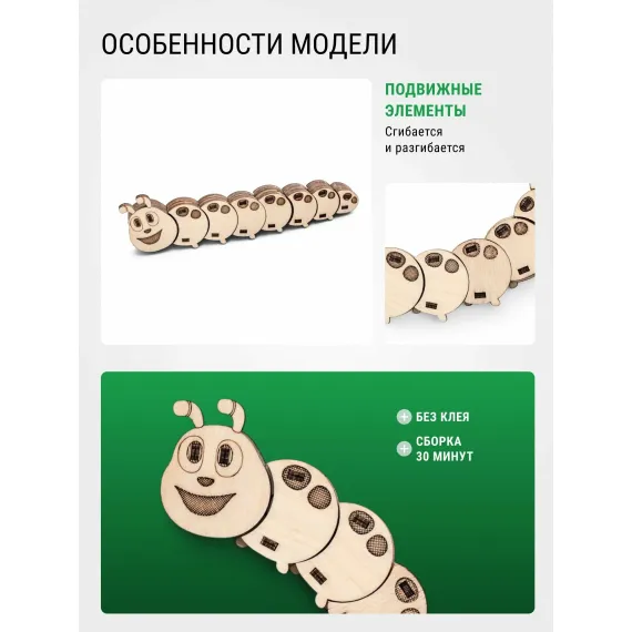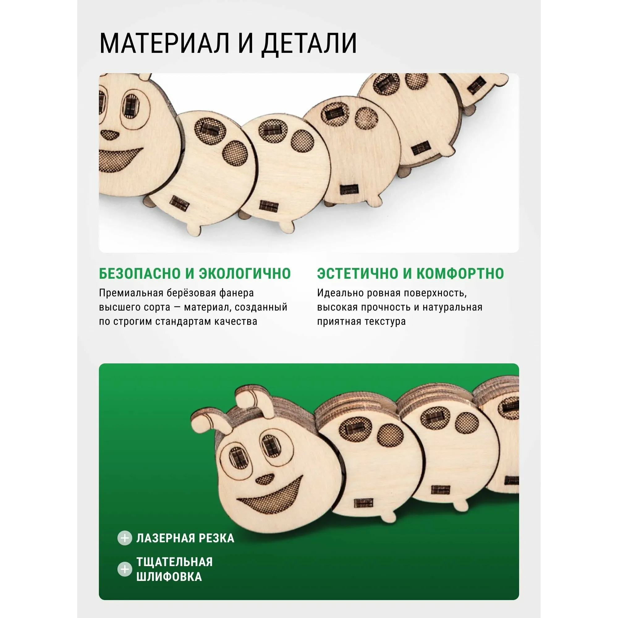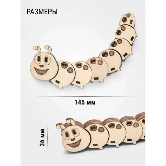 Конструктор — больше, чем просто игрушка: это праздник творчества и спокойствия. В коробке — 41 деталь, после сборки которой получается гибкая и изящная игрушка гусеница антистресс. Сборная модель представляет собой очаровательную компаньонку-гусеницу, которая мягко изгибается влево и вправо. Изготовленный из экологичного материала, этот деревянный конструктор — настоящее тактильное наслаждение: гладкие, аккуратно вырезанные детали не царапаются и дарят удовольствие от прикосновения в процессе сборки.
