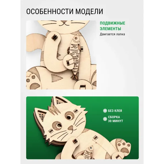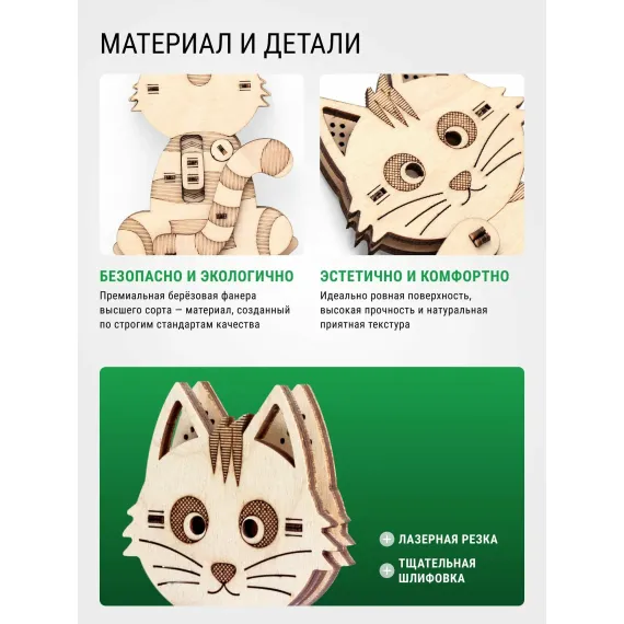 Сборная модель подходит как для мальчика, так и для девочки. Универсальность делает его идеальным выбором для любой семьи, где ценят познание мира через творчество. Мини конструктор компактный и аккуратный, но одновременно обладает наполненным содержанием. Эта головоломка для детей, станет отличным выбором для вашего малыша. Деревянные игрушки изготовлены из естественного материала, обладают экологической безопасностью и эстетикой, присущей настоящему дереву. Каждая собранная модель серии Конструктор животные займет малыша на длительное время. Игрушка кот — забавный и милый питомец, но его конечный образ остаётся загадкой до окончания сборки. Объёмная фигурка, которая воспринимается как конструктор 3д, достойна занять свое место на полке.
