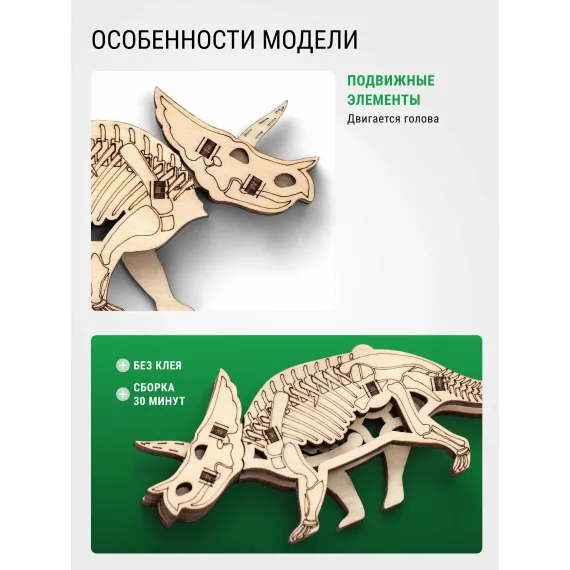 Это одновременно и головоломка для детей и механический конструктор — собрать его правильно и увидеть механизм в действии — настоящее достижение. При взгляде на собранную фигурку легко узнать в ней динозавра. Точнее, это трицератопс — мощное, величественное, словно вернувшееся из доисторических времён животное. Это одновременно и игрушка и конструктор, с характерным силуэтом, короной и рогом. Конструктор для малышей может стать первым знакомством с формами и механикой. Родители лишь аккуратно помогают в начале, а дальше — всё в руках ребёнка. Что делает этот набор особенным: * Подвижный механизм внутри модели оживляет её после сборки, добавляя магию движения.