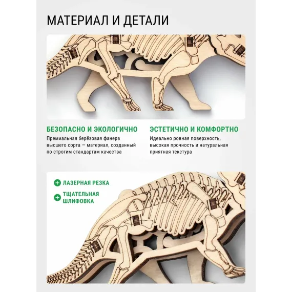 Этот деревянный конструктор — не просто игрушка, а уникальная 3д модель, позволяющая ребёнку не только собрать фигурку, но и увидеть, как она оживает, что придает процессу загадочность и динамику. Конструктор детский, и в процессе сборки развиваются многие навыки, в том числе мелкая моторика, внимание, пространственное мышление. Он компактный, понятный и привлекает внимание. Ищите конструктор для мальчика? или конструктор для девочки? Модель универсальна и одинаково понравится всем малышам, ведь динозавры вызывают интерес у всех детей.
