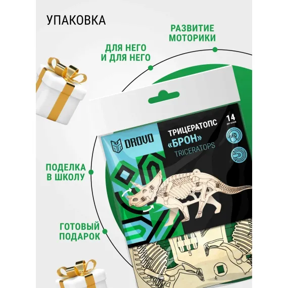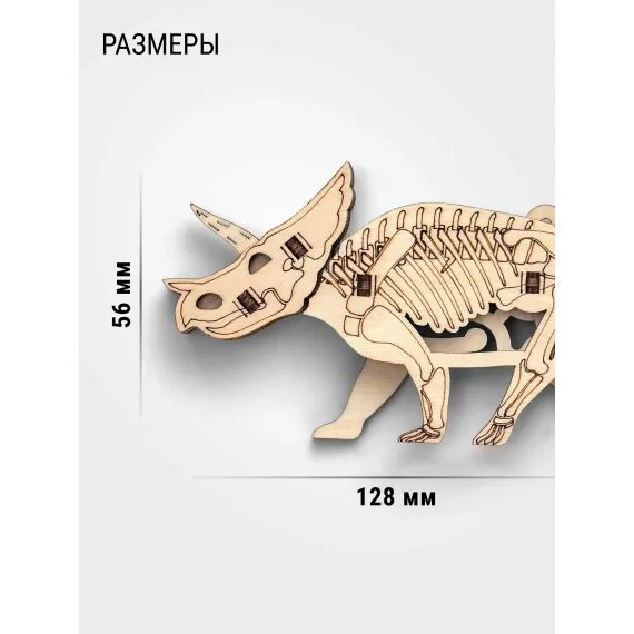 Деревянный конструктор динозавр Трицератопс - это мини-набор, в котором присутствует целый мир открытий. Он состоит из 14 точно подогнанных элементов, собранных в виде грозного, но мирного диназавра. Сборка будет под силу даже начинающим, и займет около получаса. При этом в теле динозавра скрыта шестерёнка, оживляющая конструкцию.